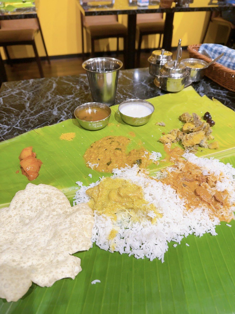 バナナの葉っぱに盛り付けてくれて、無限お代わりもできるの