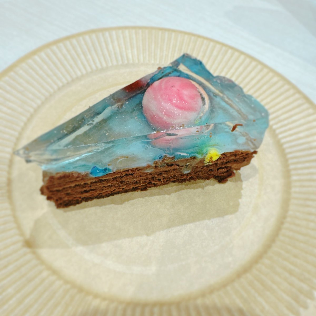 ぷるんぷるんのギャラクシーゼリーに下はチョコレートケーキでした。惑星はなんだったかわからなかったけどむにむにで美味しかった。マシュうぅありがとおぉ🤤 #FGOラジオ