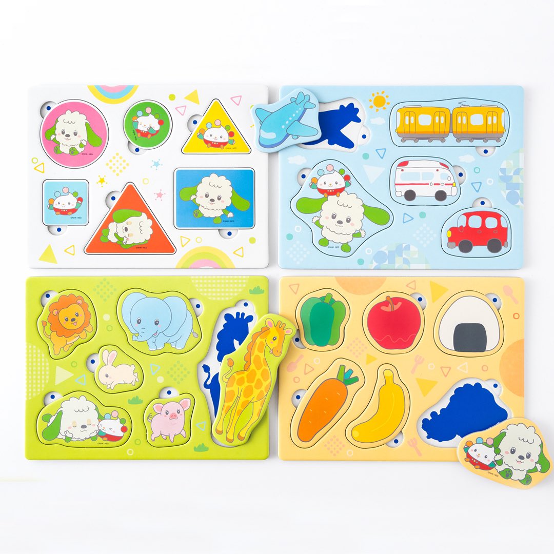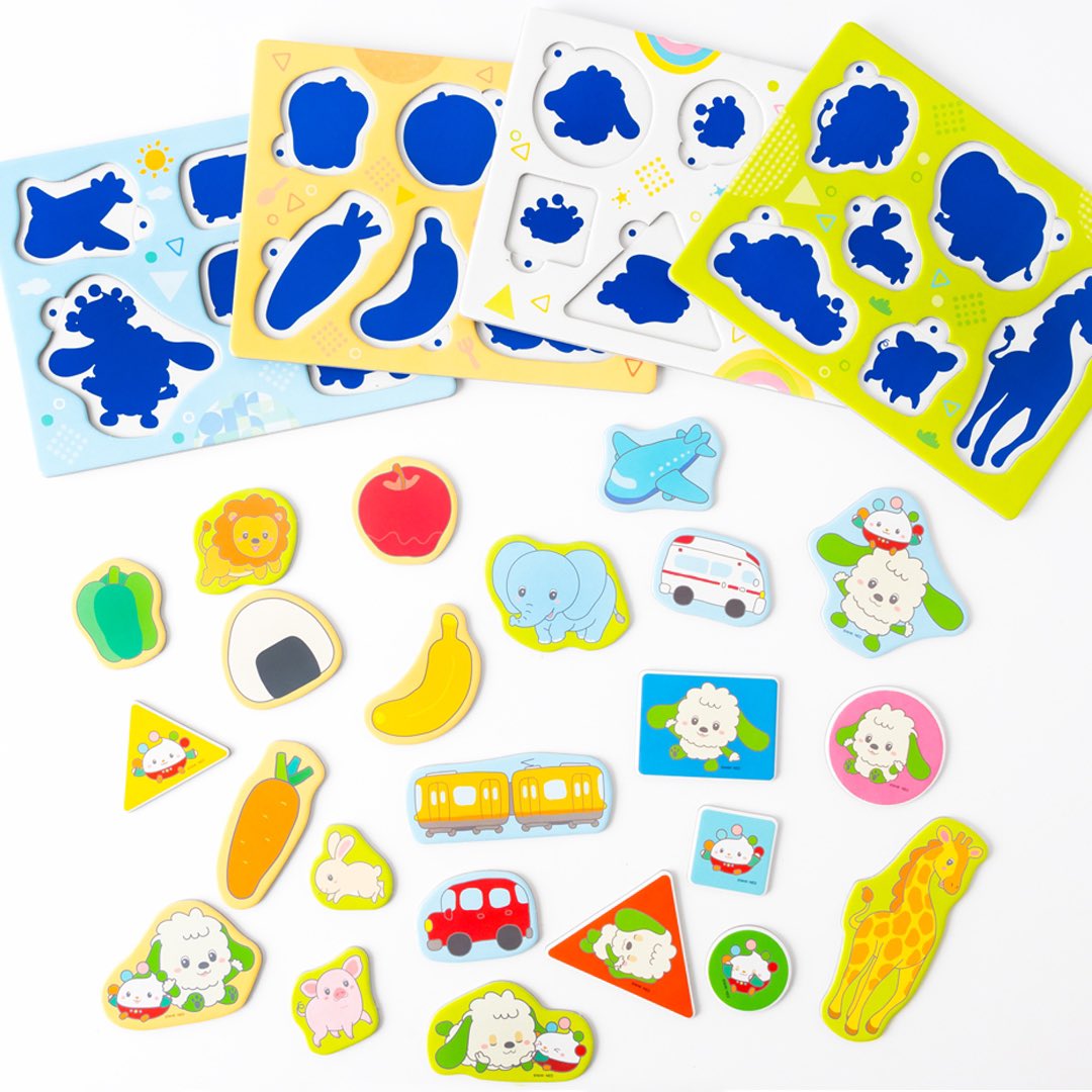 形に合わせてぴたっとはめるファーストパズル。「ワンワン」と「ぽぅぽ」以外にも、「どうぶつ」「たべもの」「のりもの」の4シート23ピースでいろいろ遊べます。厚みがある丈夫なピースです。