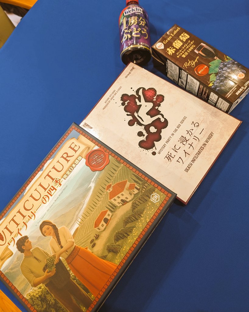 春のボドゲ会。ワイナリーゲームのためにぶどうジュースを買ってきてくれた友だちのセンスの良さよ🍇