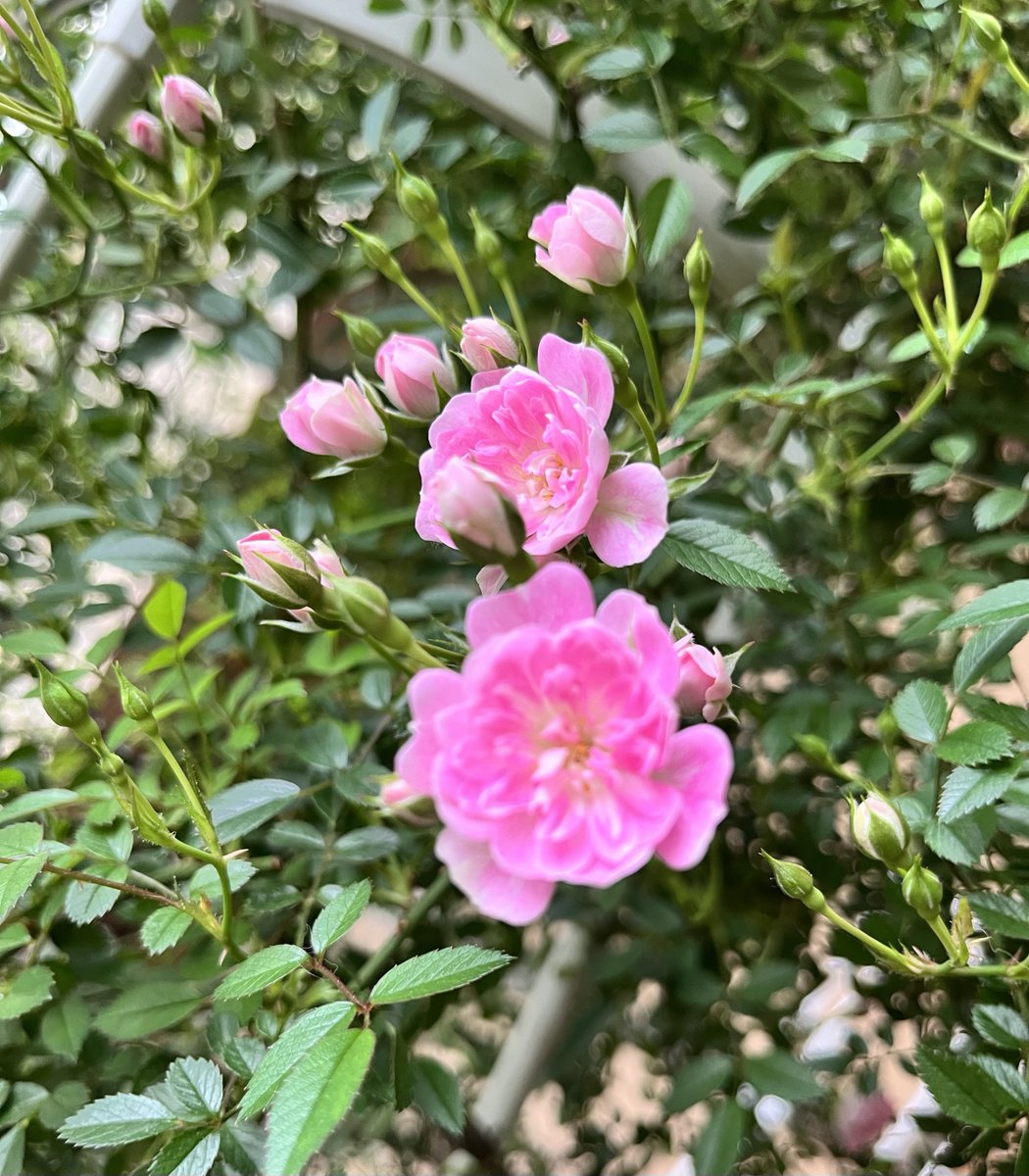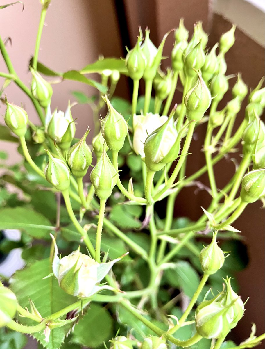 キングサリ(黄花藤)の蕾が開いてきました。ドキドキ。いつもうどん粉病に見舞われて春薔薇は壊滅的だったミミエデンの蕾が健やかに育っています。初ブーケが見られるかも。夢乙女もたくさん蕾をつけました。可愛い💕紅藤は今年も葉っぱだけです(笑)ツルをぐんぐん伸ばしています。