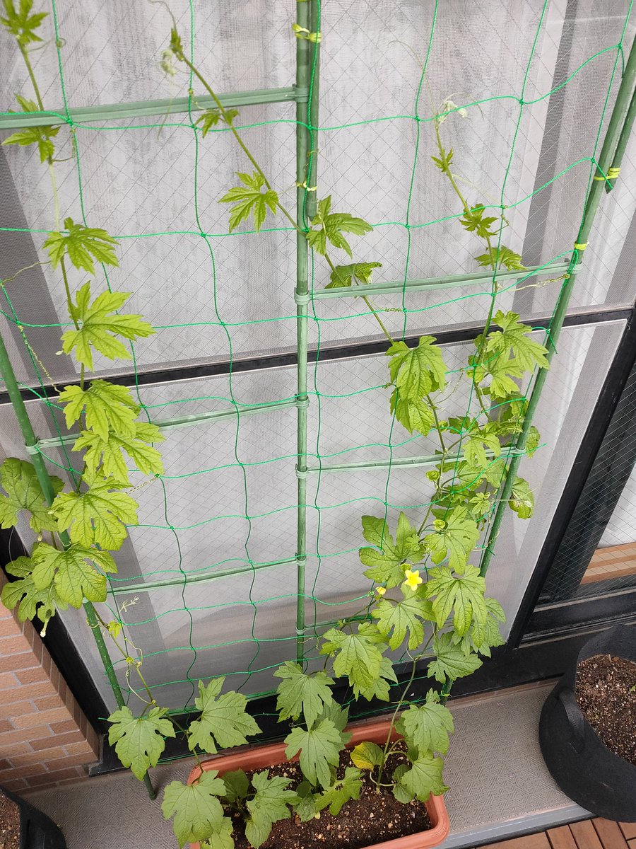ゴーヤは、緑のカーテンにはまだまだ遠い。上へ上へと成長する。切れても切れてもバク上がり中😅3週間でこんなに伸びたよ!