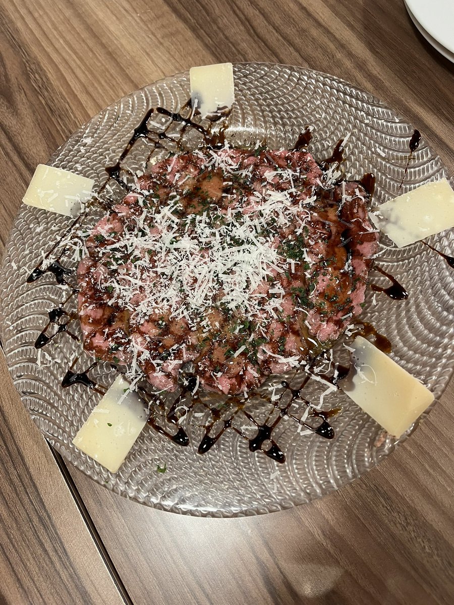 お肉のカルパッチョだったかな?😆ちがうかな?笑すごくおいしかった!バルサミコ酢とチーズの相性いい✨✨