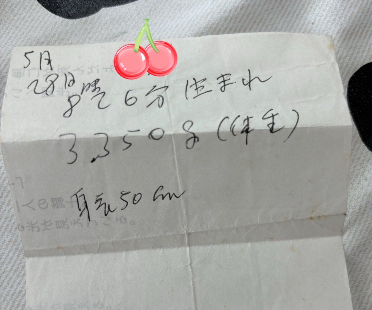 こんなメモが出てきました。娘が生まれた日時、体重、身長まで書いてある