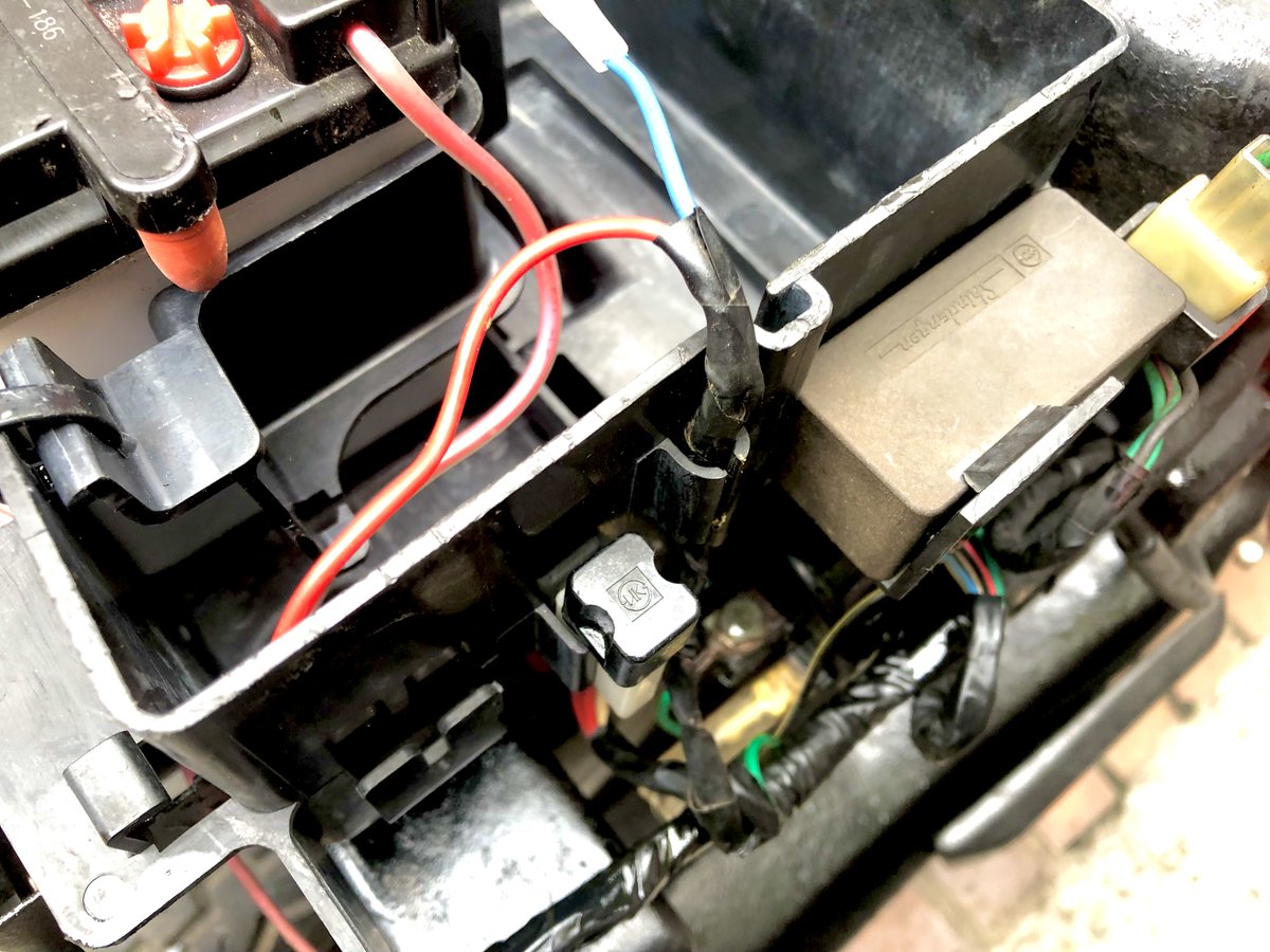 某ショップから引き上げた旧車、6Vのバッテリーは根元から線が切れていてコネクタを開け半田で線付け。液も半分ぐらいしか無かったけどレアなので掃除して液を入れ、今5.7V、あと少しで復活。ハーネスや抵抗、リレーボロボロで組み直した。電装系バッチリ、エンジンも安定してスッキリ。
