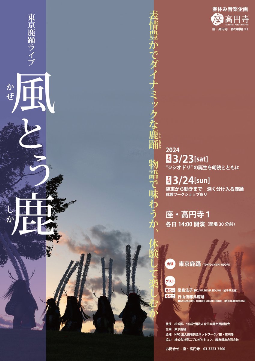 毎年、春休みに開催、家族で楽しめる音楽企画。今年は東北地方に伝わる郷土芸能「鹿踊(ししおどり)」をお届け。一日目は桑島法子さんをゲストに迎えた朗読、二日目は「行山流都鳥鹿踊」の皆さんを迎えたワークショップや比較演舞で、鹿踊の魅力を掘り下げます。明日発売!